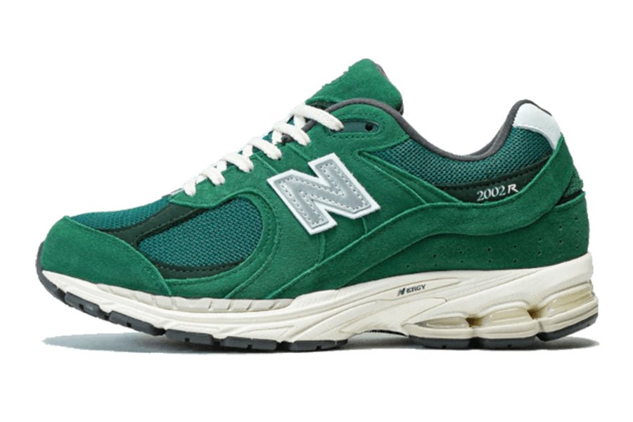 der new balance 2002r suede pack forest green hat ein türkisgrünes mesh-obermaterial mit tannengrünen wildledereinsätzen. der schuh hat ein graues new balance branding und eine weiße mittelsohle.